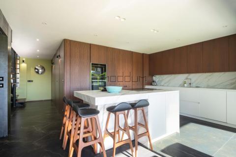 Accedemos a la vivienda a través de un elegante acceso lateral que actúa como hall de entrada, inundado de luz natural y que nos conduce al amplio y luminoso salón comedor con vistas al jardín que da paso a la cocina, dotada de electrodomésticos de primeras marcas, una isla con espacio para cocinar ideal para disfrutar en la mejor compañía. Además, dispone de salida directa al porche en el que contemplar las bonitas vistas al mar. Completa la planta una práctica zona de lavandería, una despensa y un elegante aseo.